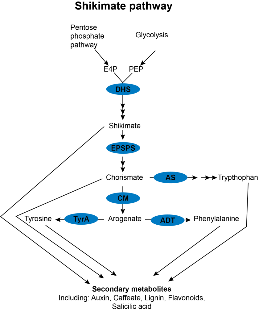 Yokoyama and colleagues studied the Arabidopsis DHS enzymes. DHS is the enzyme that catalyses the first reaction of the shikimate pathway, whose products are the aromatic amino acids tyrosine, tryptophan, and phenylalanine. These amino acids are not only needed for protein synthesis but are also functioning as precursors for various secondary metabolites, including auxin, lignin, and flavonoids.